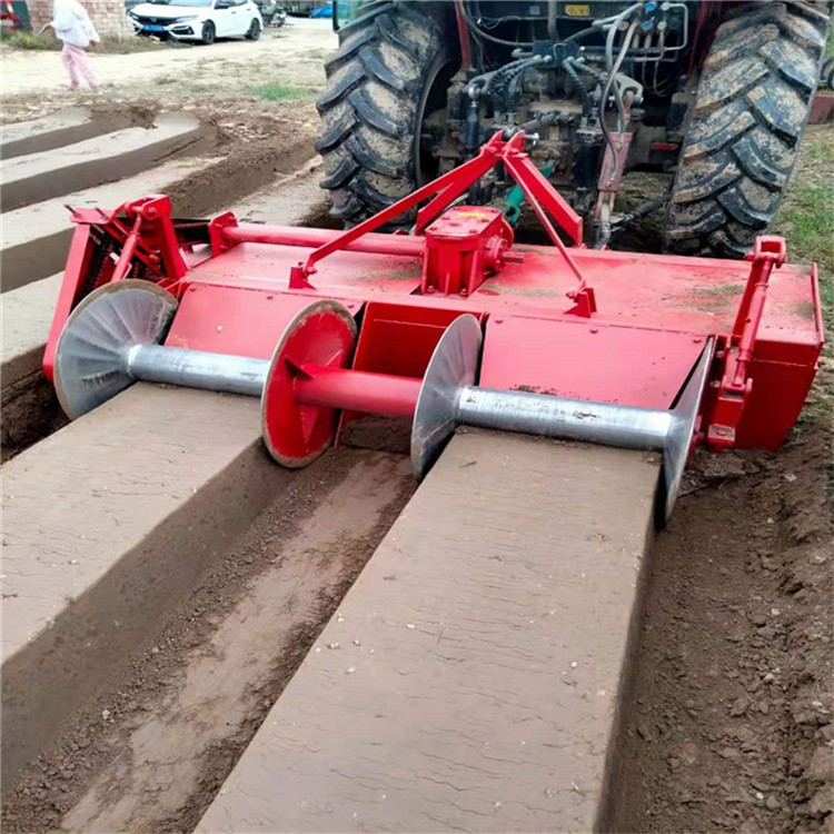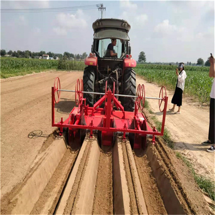 大蔥開溝機一般行距為80-85cm,溝底寬25cm,有7-10公分的軟土方便移栽,溝深30cm,一般使用40馬力以上拖拉機帶,一臺雙溝開溝機,一天可以工作50畝左右。
